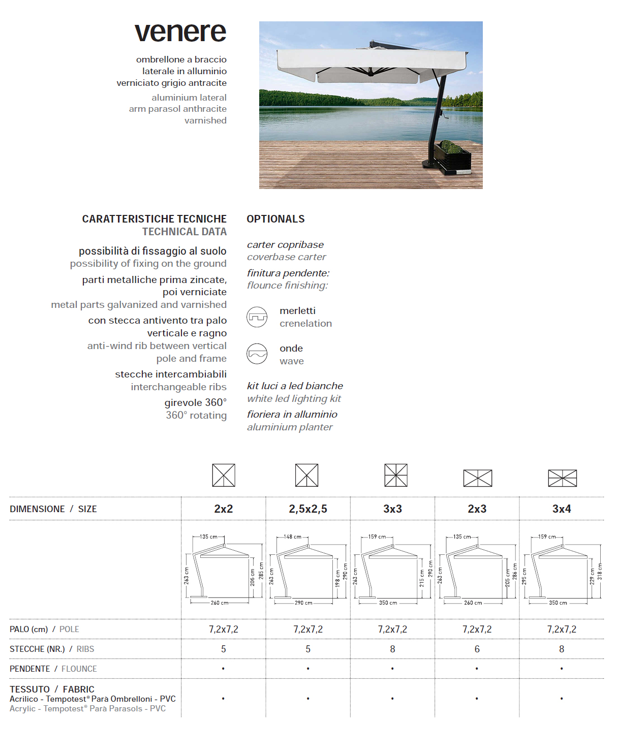 100% Acryl, gr. 320 m / q, schimmelwerend, waterafstotend en weerbestendig, beschikbare kleuren: naturel, bosgroen, touw, bordeaux, antraciet grijs, wit.